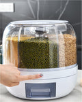 - [Multi-purpose in one machine] The rotating dry food dispenser has a capacity of 12 lbs (6 kg) of dry food, can store up to 6 different dry foods, keep your kitchen looking organized. The circular grain dispenser can hold a variety of foods, including rice, millet, black rice, barley, all kinds of rice, mung beans, red beans, all kinds of small beans, not suitable for large grains such as canned, soybeans, and beans